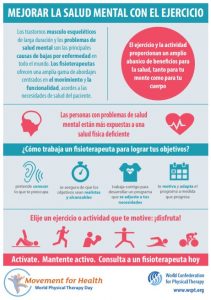 El ejercicio terapéutico, siempre dirigido por profesionales de la Fisioterapia, es un tratamiento que se basa en la evidencia, para abordar problemas como la depresión. Según los datos de la WCPT, una de cada cuatro personas sufrirá un problema de salud mental de diversa índole a lo largo de su vida y las personas con este tipo de enfermedades están más expuestas a una salud física deficiente, que llega a provocar hasta el 70% de las muertes prematuras en estos pacientes.